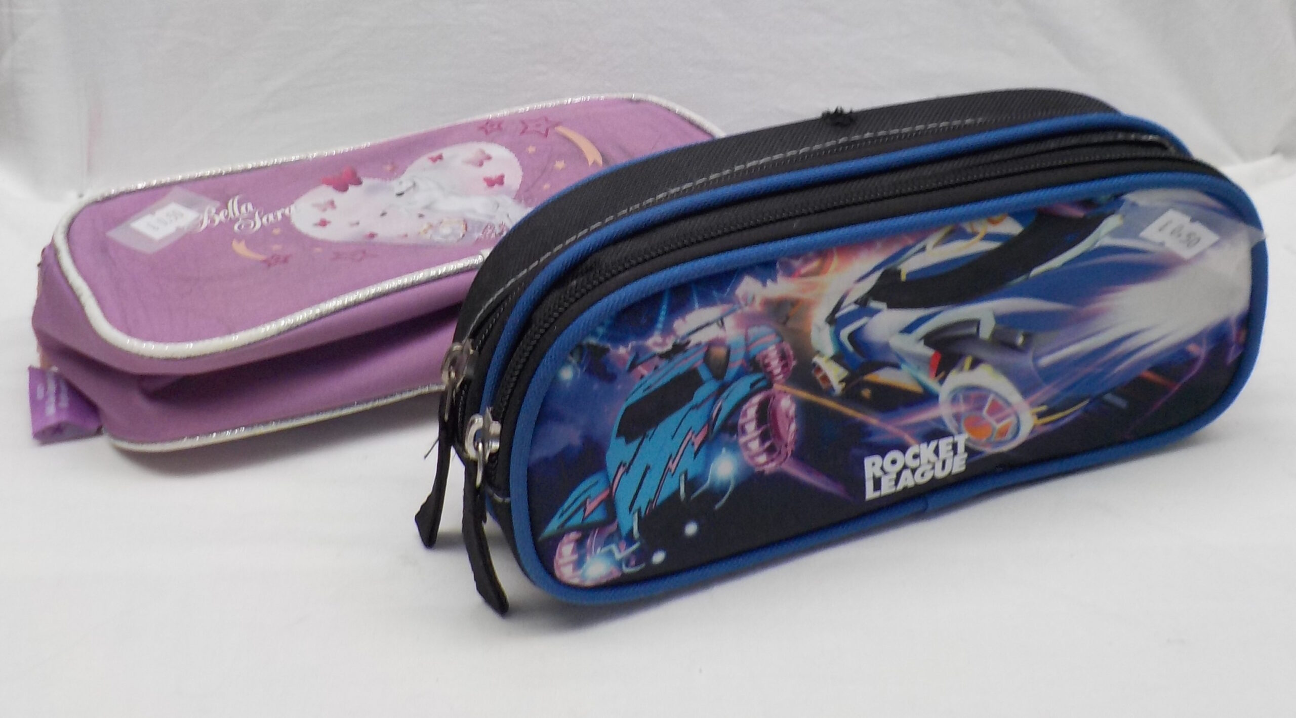 Lot de deux trousses à crayons : une rose style girly et une bleue Rocket League.